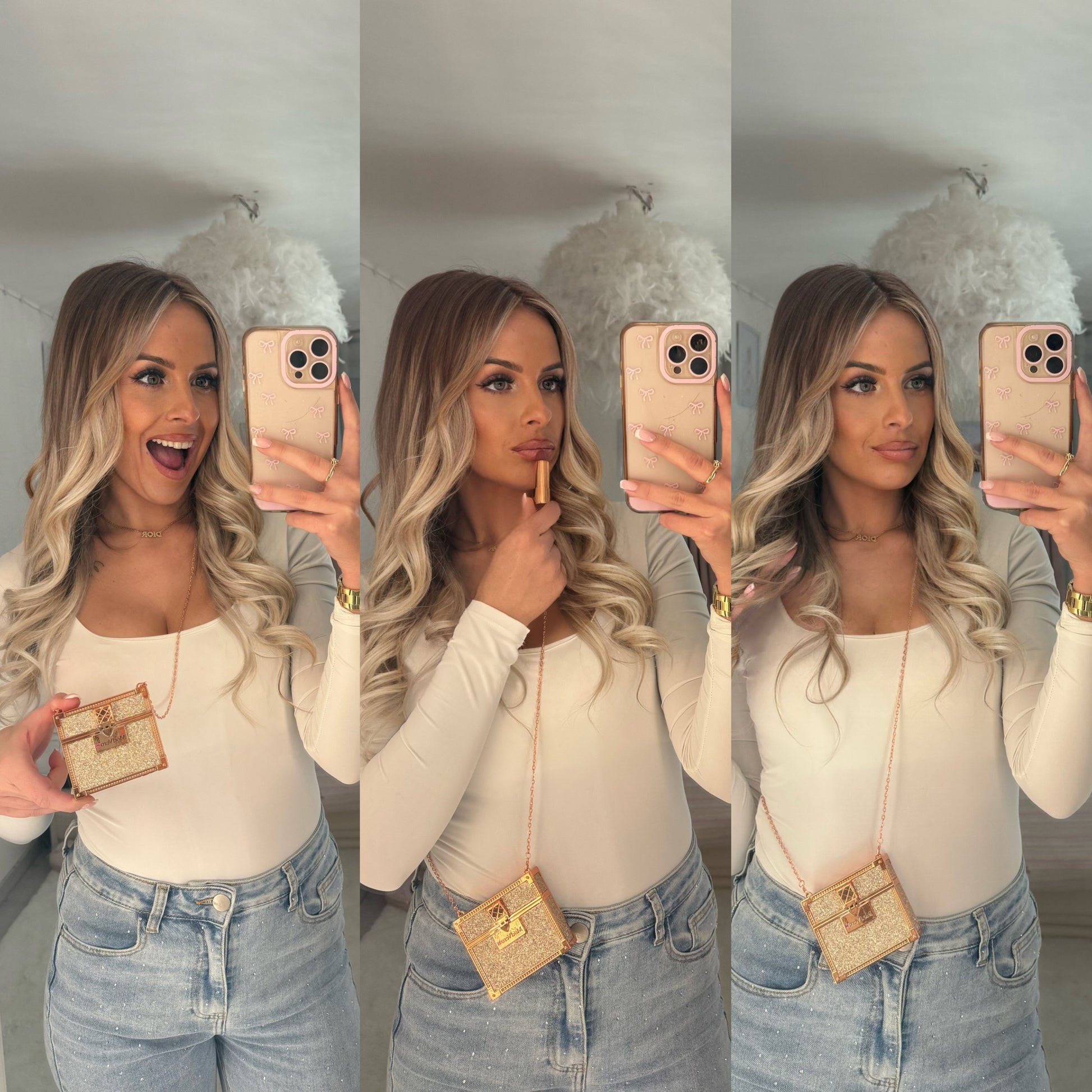 ✨ Son design rose gold pailleté ultra chic en fait une pièce forte, idéale de jour comme de nuit.